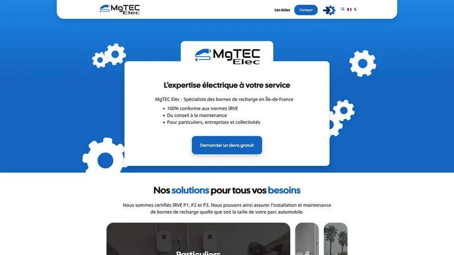Découvrez le site web innovant de MgTEC pour l'installation de bornes électriques, équipé d'un agent IA qui maintient automatiquement les informations sur les aides gouvernementales à jour. Design centré client avec dégradé bleu électrique.