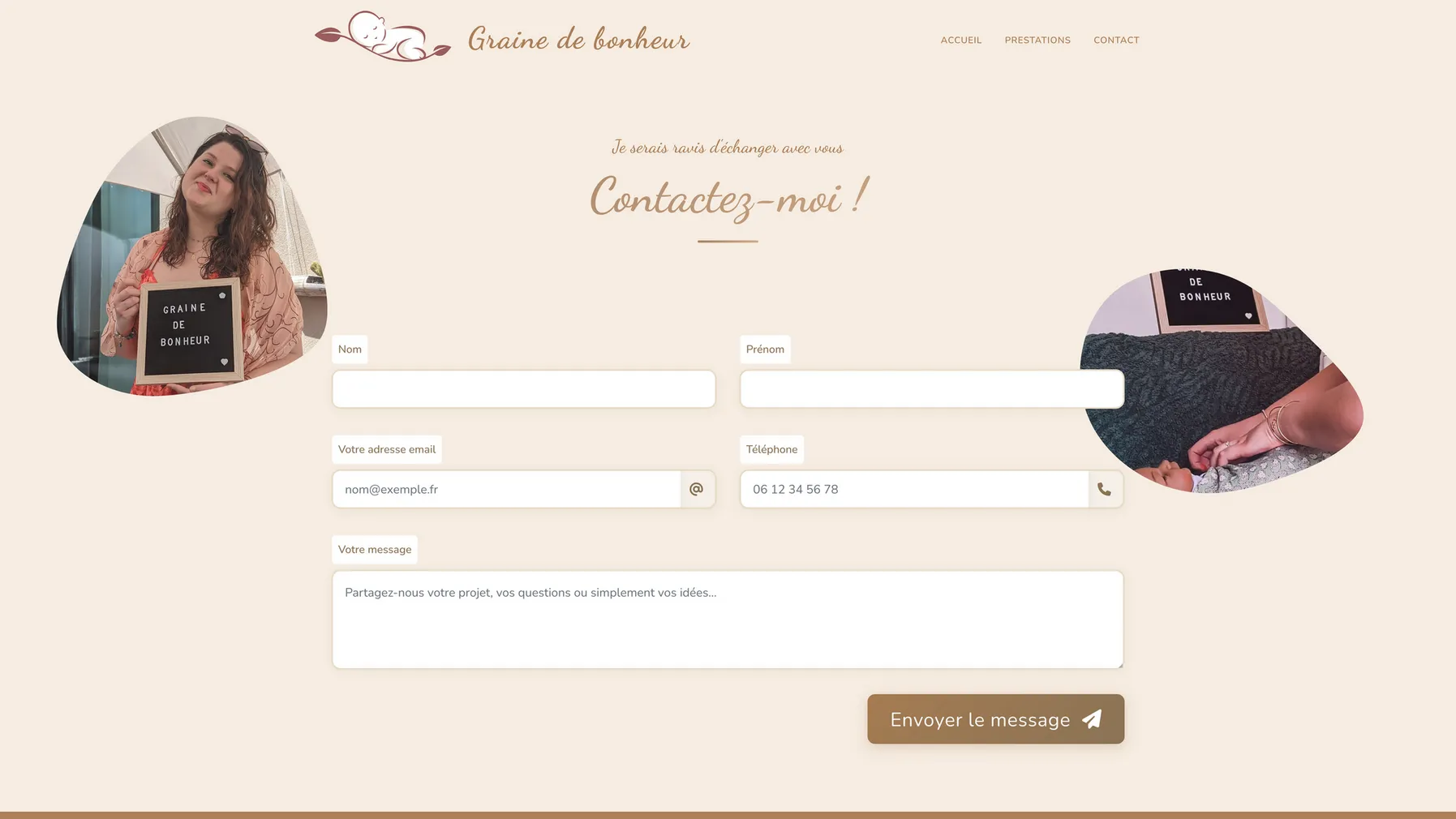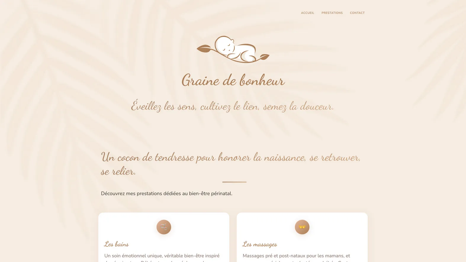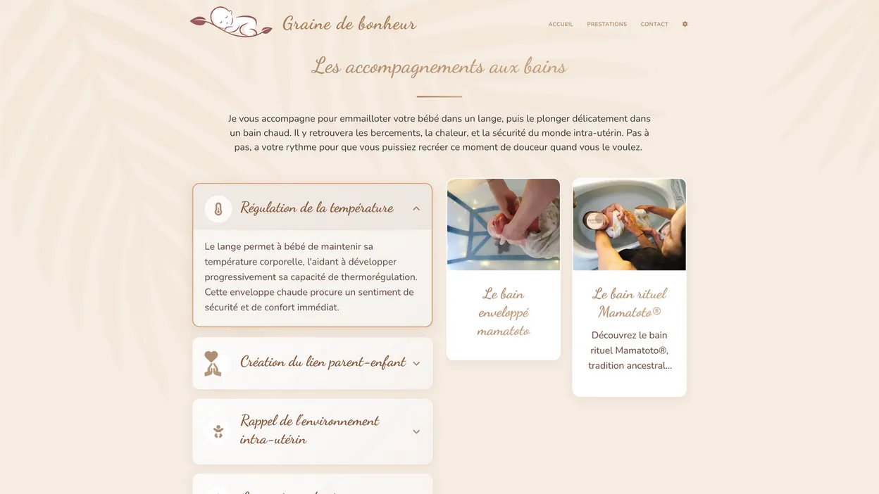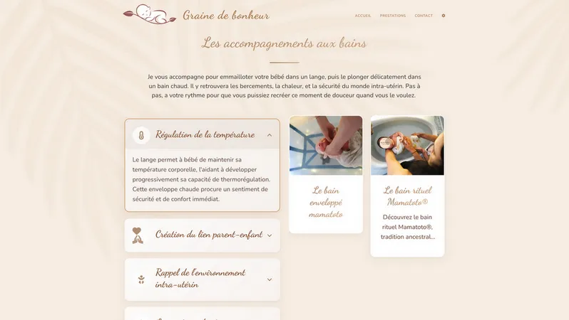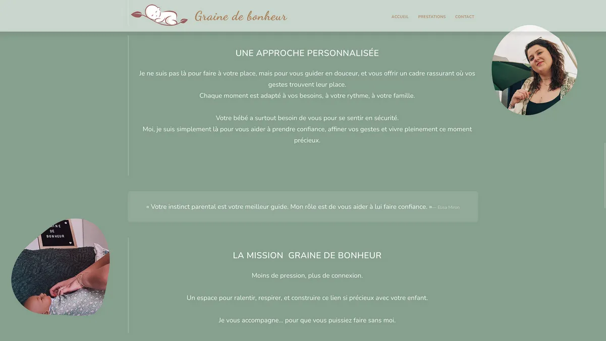 SpĂ©cialisĂ©e dans le bien-ĂȘtre prĂ©natal et postnatal, Graine de bonheur proposait des services de qualitĂ© mais avait besoin d'un site internet reflĂ©tant la douceur et la chaleur de son approche. Le dĂ©fi Ă©tait de crĂ©er une plateforme intuitive permettant de prĂ©senter ses prestations tout en facilitant la prise de rendez-vous et la gestion de questionnaires personnalisĂ©s complexes.