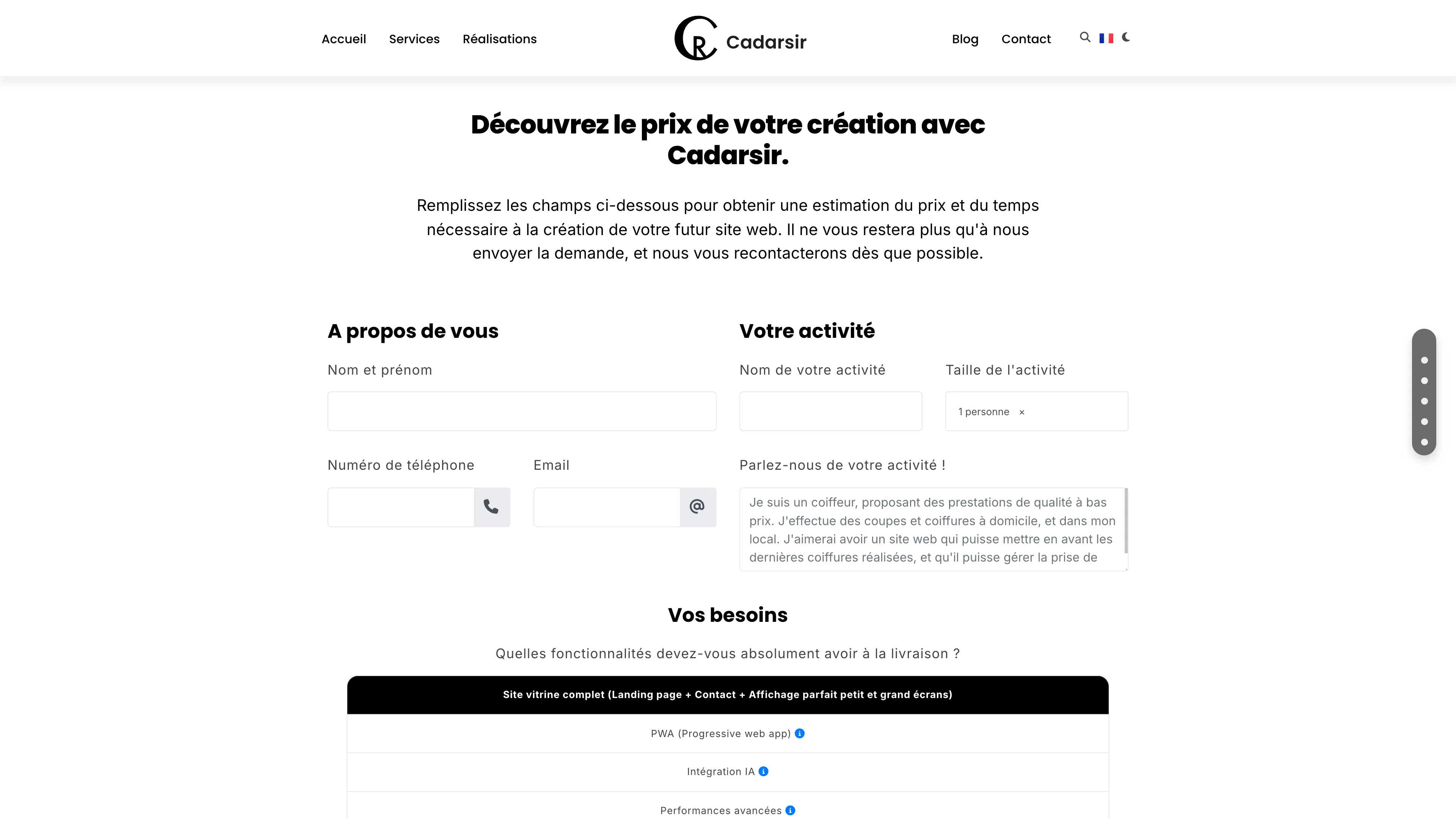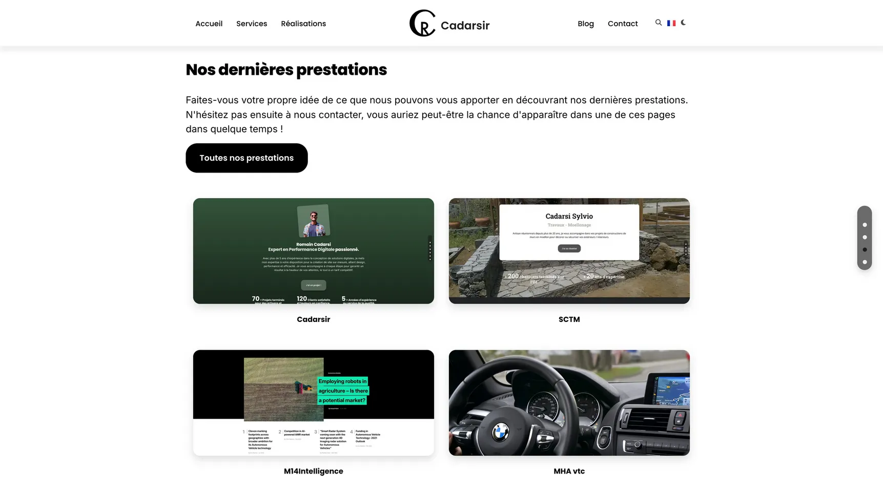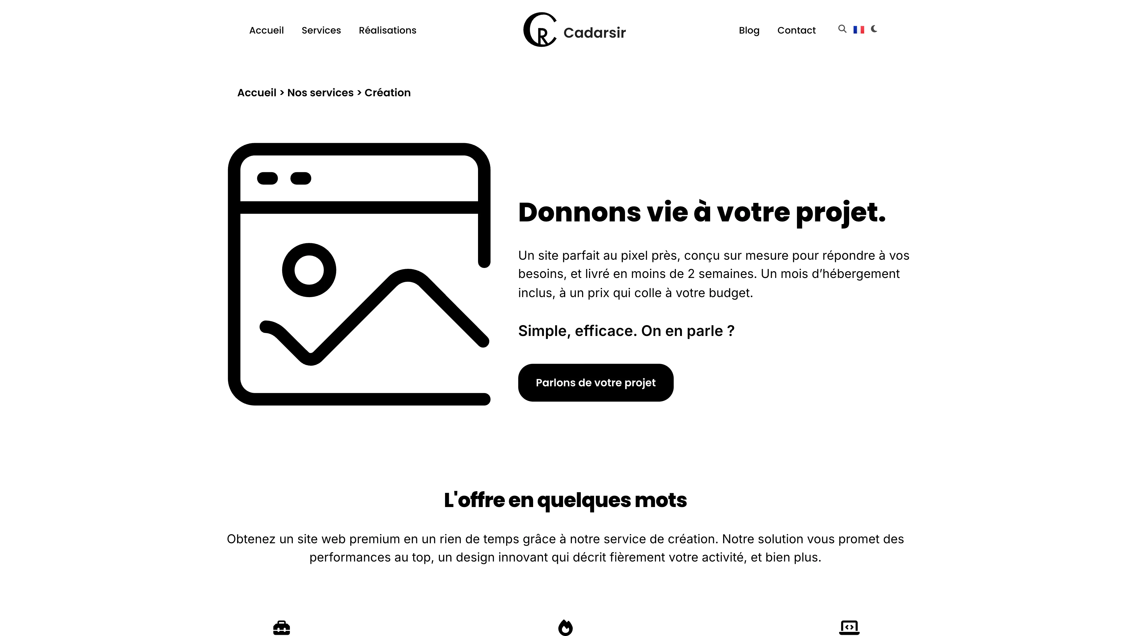 Bien plus qu'un simple site web, Cadarsir constitue un laboratoire d'innovation continue où chaque fonctionnalité, chaque optimisation et chaque détail technique reflètent l'expertise et la vision avant-gardiste de l'agence. Cette approche permet aux clients potentiels de découvrir concrètement le niveau de sophistication et de performance qu'ils peuvent attendre pour leurs propres projets.