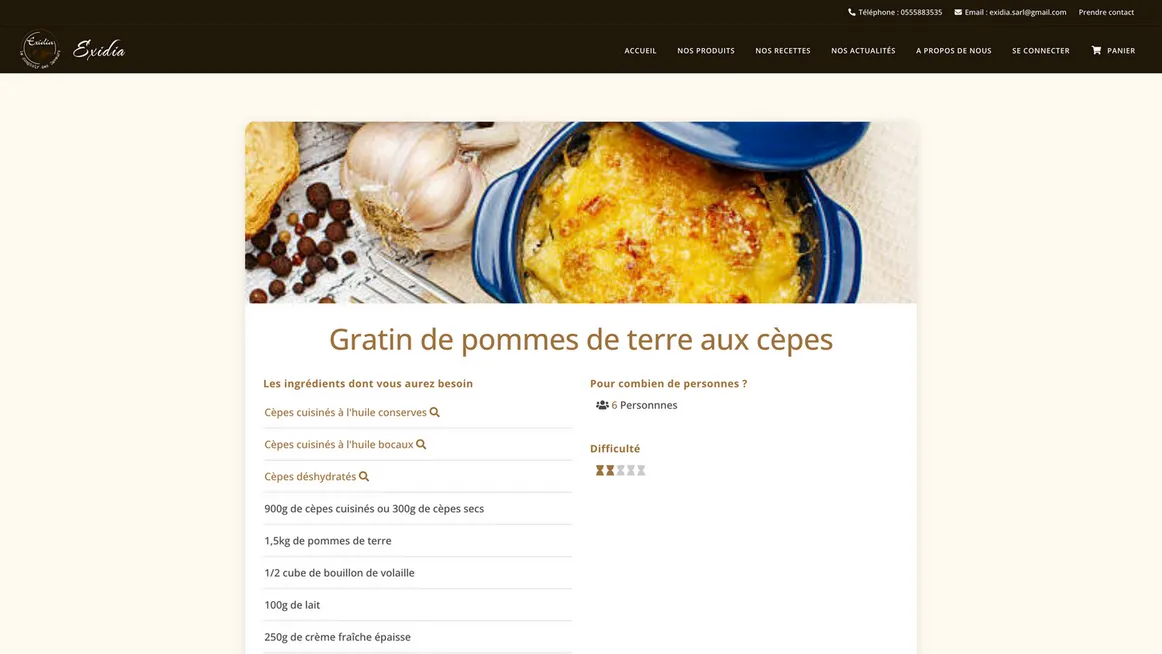 La fonctionnalité phare du site Exidia réside dans son système innovant de liaison dynamique entre produits et recettes. Ce module permet aux visiteurs de découvrir comment cuisiner et valoriser chaque produit commandé, créant une véritable expérience culinaire.